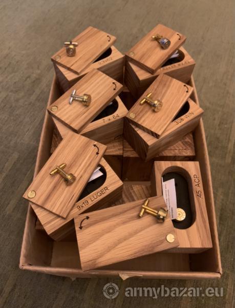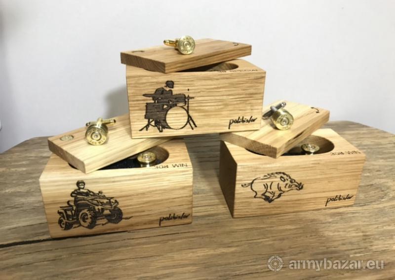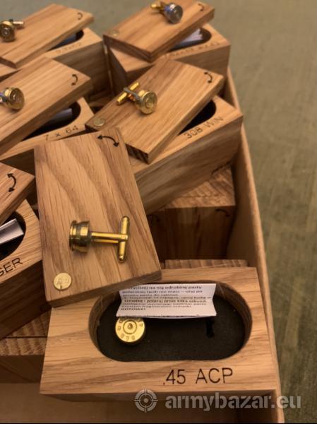 Opis: Ręcznie robione eleganckie spinki do mankietów koszuli. Zrobione z łusek po amunicji (różne kalibry - np .45 ACP, 308 WIN, 7x64,.30-06 SPRG, 7.62X39, 9.3X62). Zapakowane w gustowne pudelko wykonane z olejowanego dębu. Możliwe laserowe wypalenie prostego piktogramu lub dedykacji.